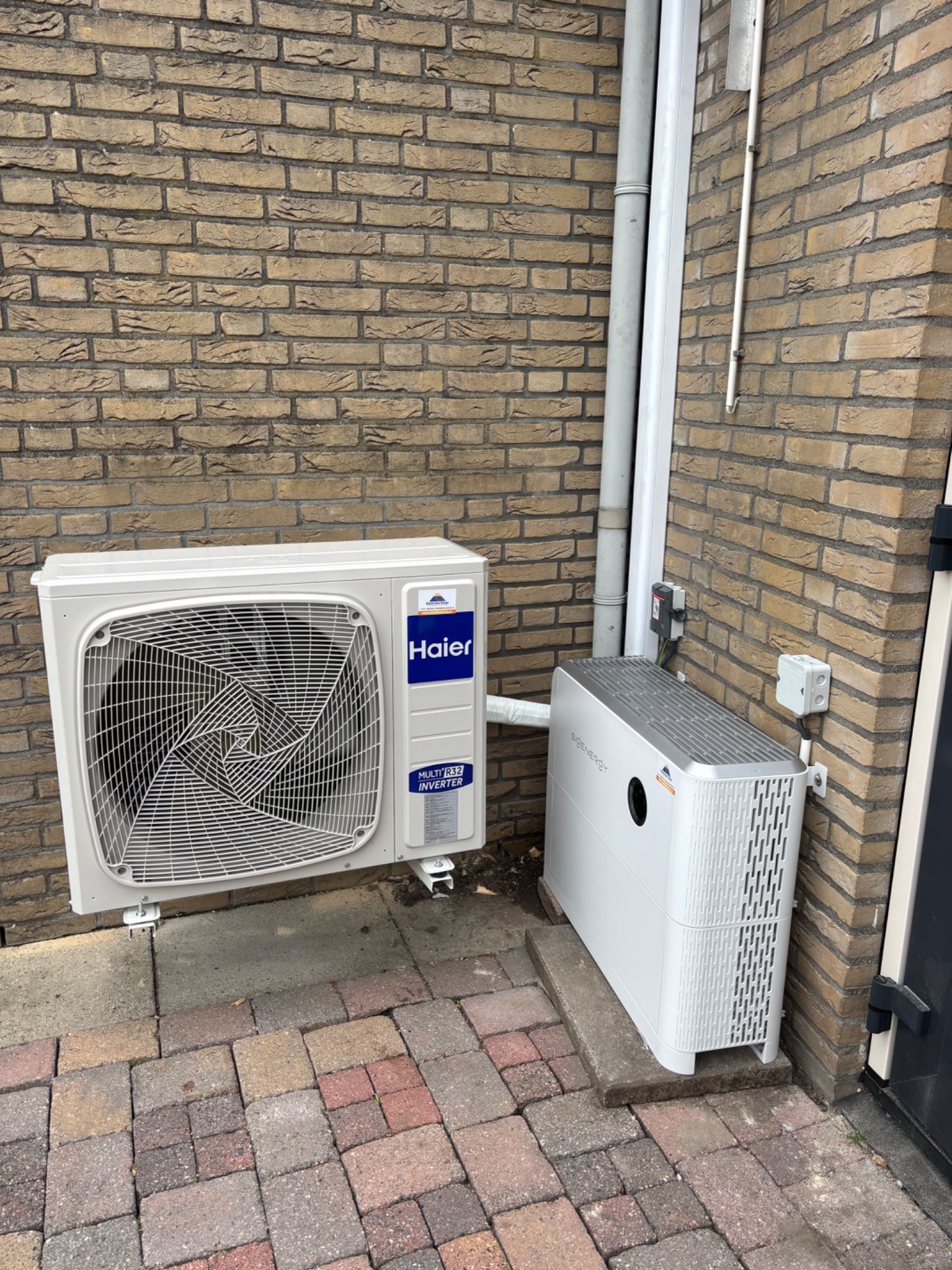 Hier hebben we en 10 kWh thuisbatterij geplaatst in combinatie met 10 zonnepanelen. Deze laden direct de accu op en voorzien de woning van elektriciteit. De airco hebben we ook geplaatst voor het verwarmen van de woning. Deze wordt gebruikt op momenten als de batterij vol zit van stroom van de zonnepanelen, of opgeladen met het dynamsiche enerigecontract met de meest goedkope prijs!